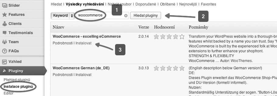 3. Plugin WooCommerce se vám objeví ve výsledcích vyhledávání hned jako první, klepněte na Instalovat (3).