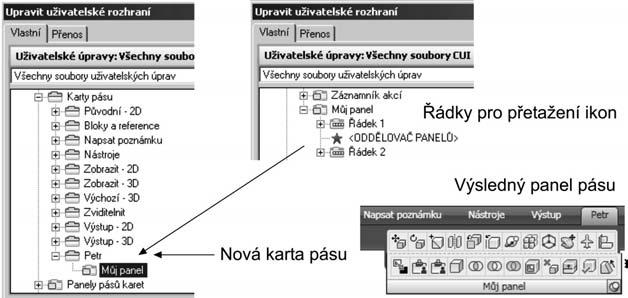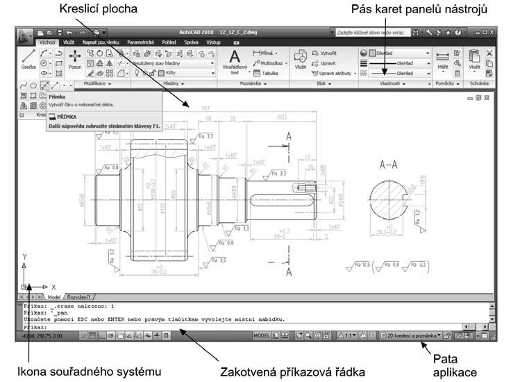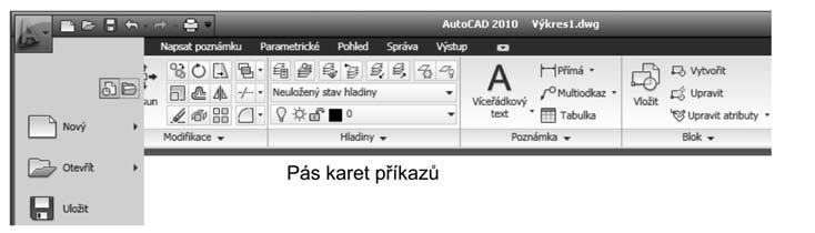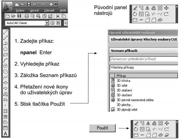 Jednotlivé způsoby definice příkazů budou detailně popsány v následující kapitole, proto uveďme nyní pouze ukázku příkazu pro manipulaci s USS pomocí příkazové řádky a efektivní způsob definice příkazu pomocí ikon, které jsou uspořádány do panelů nástrojů.