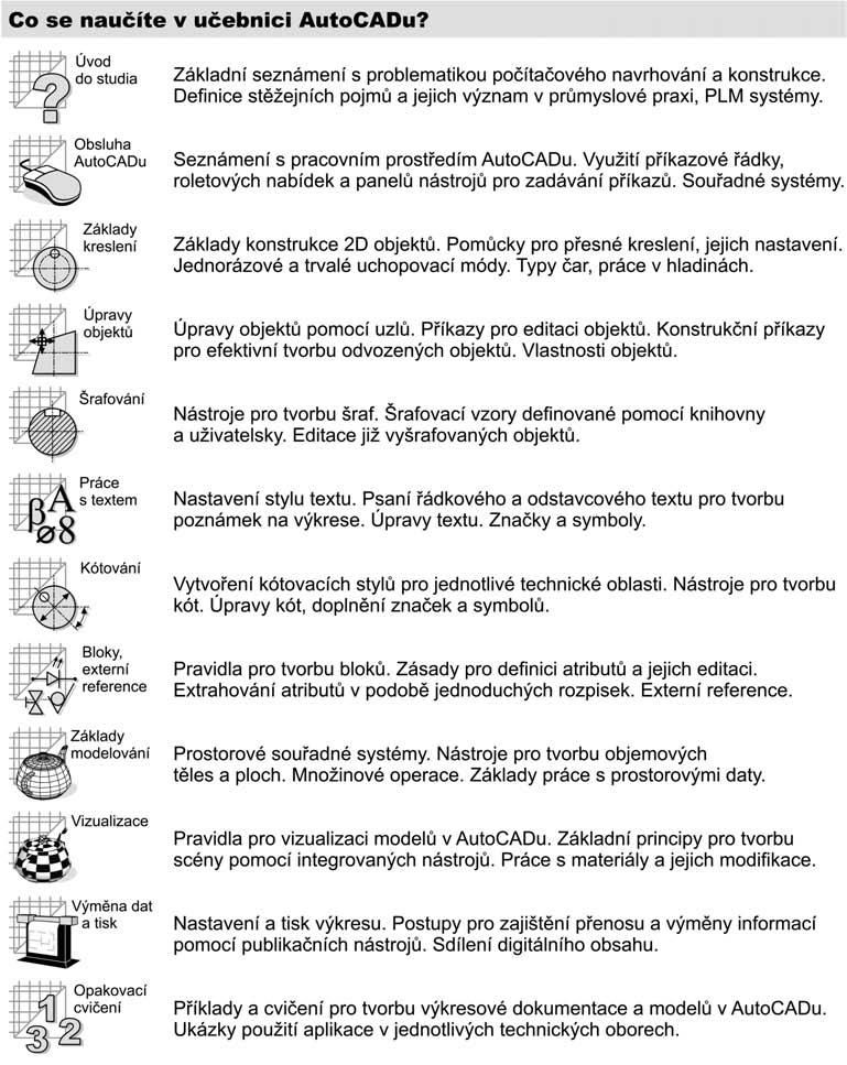 Metodika a postup studia vychází z titulů věnovaných starším verzím AutoCADu, které podle ohlasu vytvořily určitou referenci výuky CAD na našich školách. Obsah učebnice navazuje na tuto tradici. Z tohoto důvodu jsme se snažili zachovat celkovou koncepci učebnice, aby práce s ní byla snadná jak pro vyučující, tak pro studenty.