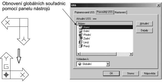Příkaz: Uss (_Ucs) volba Ulož, Vymaž a oBnov lze použít také příkaz Diauss pro vyvolání dialogu správy USS