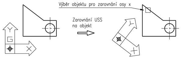 [PLocha/poJMenovaný/obJekt/Předchozí/poHled/Globální/X/Y/Z/ZOsa] <Globální>: zvolíme zarovnání na objekt, objekt Enter Vyberte objekt, podle něhož vytvoříte USS: myší vybereme objekt pro zarovnání, jeho bližší konec určuje kladný směr osy x