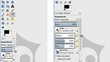 Na displejích s rozlišením menším než Full HD (1920 × 1080 px) budou rozměry karty Volby nástroje příliš malé pro pohodlnou práci. Pomůže úprava šířky Panelu nástrojů. Najeďte kurzorem myši k rozhraní mezi panelem a plochou okna obrázku, až se objeví šipky naznačující možnost úpravu šířky panelu. Stiskněte levé tlačítko myši a tažením upravte šířku panelu.