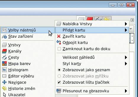 Klepněte levým tlačítkem na symbol šipky v horním dokovatelném dialogu. V rozbalené kontextové nabídce zvolte volbu Přidat kartu Z následující nabídky vyberte položku Volby nástrojů. Tuto kartu pomocí myši přesuňte na první pozici v dialogu. Další uspořádání karet v doku a následnou úpravu jeho šířky pomocí myši už nechám na vás.