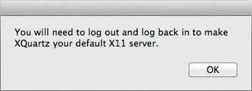 Poslední krok instalace serveru XQuartz vás vyzve k odhlášení a opětovnému přihlášení. Nejprve stiskem tlačítka OK dokončete instalaci, poté se odhlaste a znovu se přihlaste do systému.
