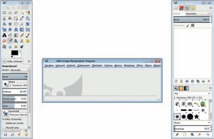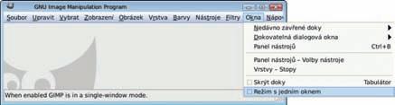 Vycházíme z nastavení GIMPu po instalaci. Přepněte GIMP do režimu práce v jednom okně pomocí příkazu Okna Režim s jedním oknem.