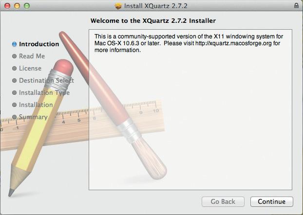 Před zahájením instalace GIMPu nainstalujte XQuartz. Jde o otevřenou implementaci serveru X11 pro Mac OS X, bez níž GIMP nepoběží. Instalační balíček XQuartz-2.7.2.dmg stáhněte ze stránky http://xquartz.macosforge. org/landing. Zahajte jeho instalaci dvojitým klepnutím, a pokračujte v instalaci klepnutím na tlačítko Continue a pokračujte v jejích jednotlivých částech stiskem téhož tlačítka.
