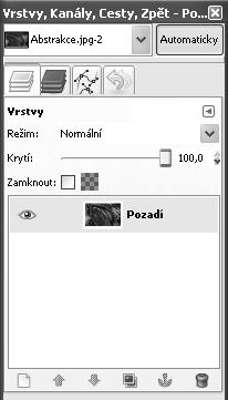 V pravém panelu pracujte s vrstvami a ovládáte jednotlivé dialogy pomocí karet Vrstvy, Kanály, Cesty, Zpět, Stopy, Vzorky, Barvy a Přechody
