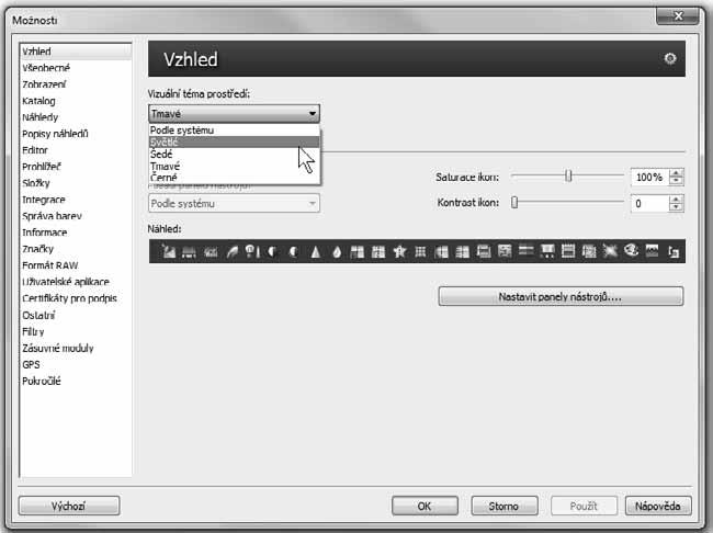 Základní vzhled okna programu, tedy Vizuální schéma prostředí, nastavíte ve skupině Vzhled. K dispozici je pět vizuálních témat; první se přizpůsobí Windows, další pak jsou Světlé, Šedé, Tmavé a Černé. Tmavé prostředí je výchozí a v tomto prostředí jsou sejmuty všechny obrázky v této knize.
