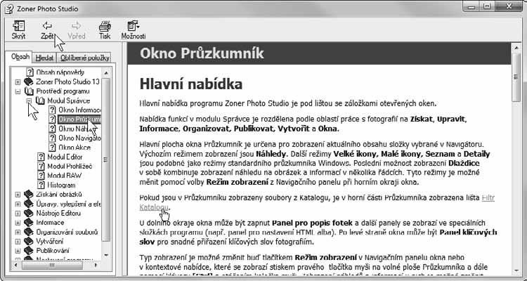 Poznámka: Okno nápovědy je standardní okno aplikace. Můžete je tedy podle potřeby minimalizovat, maximalizovat nebo měnit jeho velikost.