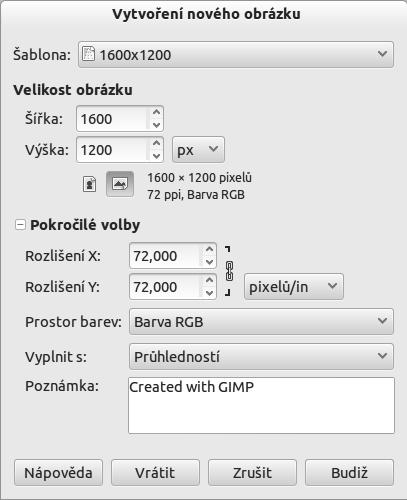 1. V GIMPu otevřete dialog pro vytvoření nového obrázku příkazem z nabídky Soubor Nový nebo klávesovou zkratkou Ctrl+N. V dialogovém okně vyberte z rozevíracího seznamu Šablona rozlišení 1 600 × 1 200. Po klepnutí na Pokročilé Volby vyberte z rozevíracího seznamu Vyplnit s: Průhledností