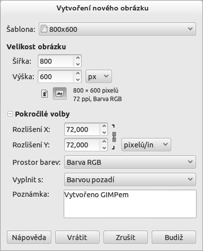 V pokročilých volbách naleznete rozevírací seznam Prostor barev, pokud k tomu nemáte jednoznačný důvod, ponechte prostor barev na Barva RGB. Stupně šedi se hodí např. při vytváření různých mapovacích podkladů sloužících pro jiné nástroje vyžadující mapu ve stupních šedé. Pomocí rozevíracího seznamu Vyplnit s můžete nastavit barvu pozadí hned při vytvoření obrázku. Text z textového pole Poznámka bude použit jako poznámka k obrázkům u formátů, které tuto funkcionalitu podporují (PNG, JPEG, GIF a další).