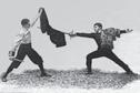 Profesor Berti se dýkou a pláštem brání útoku kordem od svého žáka. Tento snímek z roku 1905, pořízený opět ve stavovské šermírně, bychom mohli pokládat za první zárodky historického šermu u nás. Zmíněné zbraně se totiž v roce 1905 už běžně nepoužívaly.