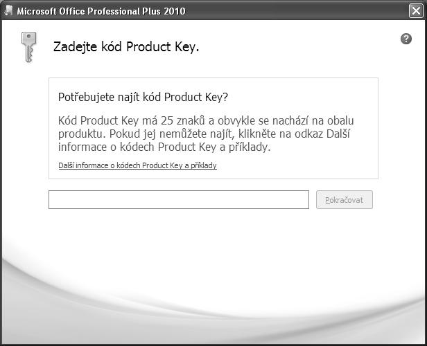 1. Ihned po spuštění jste požádáni o licenční číslo (Product Key). Toto číslo najdete na obalu instalačního média, případně na nálepce na počítači. Zadejte ho a klepnete na tlačítko Pokračovat (obrázek 1.1).