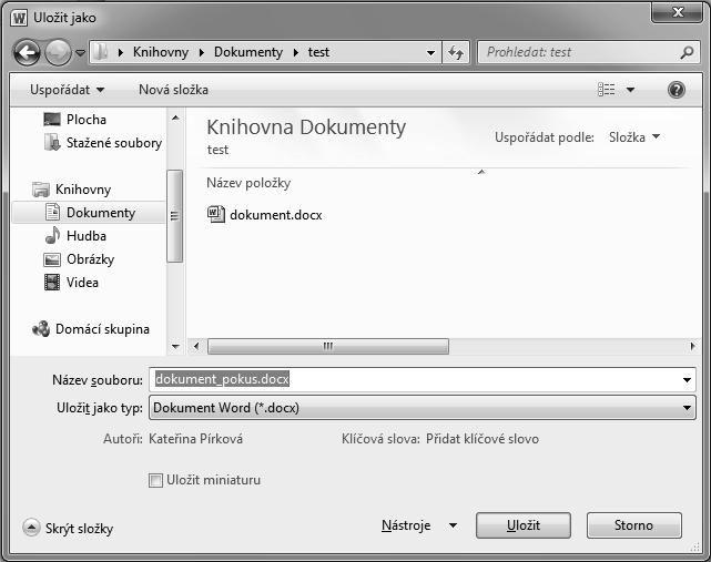 Těmito způsoby zobrazíte dialogové okno Uložit jako (obrázek 2.4). V dialogovém okně zvolíte umístění dokumentu a do pole Název souboru zapíšete název dokumentu. V poli Název souboru máte nabídnutý text z prvního řádku dokumentu. Tento text můžete přepsat a jako název souborů zvolit libovolné pojmenování. Koncovka dokumentu se doplní automaticky podle zvoleného typu.