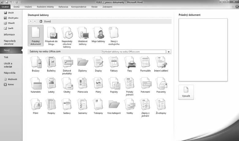 zek 2.1). V dolní části okna máte k dispozici šablony dostupné na webu Office.com a v horní části tlačítka, jejichž pomocí můžete vytvořit nový prázdný dokument nebo dokument založený na některé z existujících šablon.