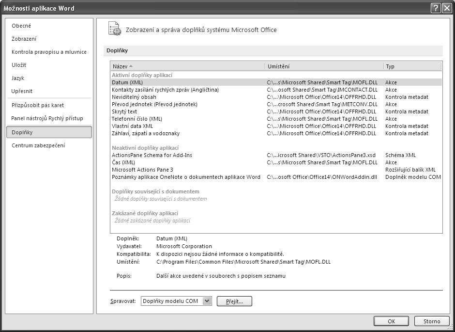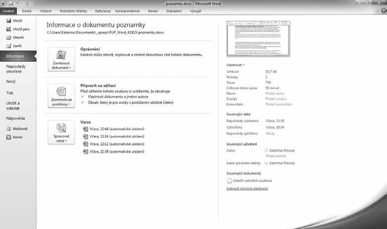 Karta Soubor (obrázek 2.10) je novinka v programu Microsoft Word 2010 a nahrazuje tlačítko Office. Po klepnutí na kartu Soubor se dostanete do zobrazení Backstage. Zobrazení obsahuje příkazy pro práci se soubory. Najdete zde příkazy pro vytvoření nového souboru, otevření, uložení, odeslání a tisk souboru. Příkazem Možnosti zobrazíte dialogové okno Možnosti aplikace Word, ve kterém máte příkazy pro nastavení celého programu.