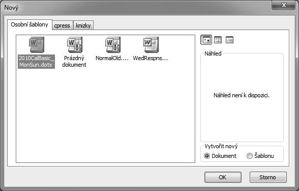 Potřebujete-li vytvořit nový dokument na základě existující šablony, klepněte na kartu Soubor ➝ Nový, kde máte k dispozici následující možnosti při práci se šablonami: