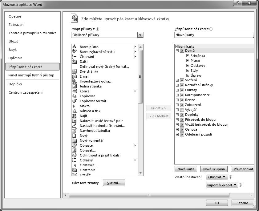 V zobrazeném dialogovém okně (obrázek 2.9) můžete upravit pás karet. Okno je rozdělené do dvou částí. V levé části najdete příkazy, které můžete umístit na pás karet. V levé části okna máte nahoře rozevírací seznam Zvolit příkazy z, ve kterém si můžete vybrat skupiny, z nichž pak zvolíte konkrétní příkazy. V pravé části jsou k dispozici karty, skupiny a příkazy, které jsou nyní už na pásu karet. V levé části okna vyberete příkaz a klepnutím na tlačítko Přidat ho umístíte do pravé části do zvoleného umístění. Na pásu karet si můžete vytvořit vlastní karty a skupiny.