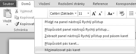 příkazu se pás karet vrátí do svého minimalizovaného vzhledu. Obnovení pásu karet provedete poklepáním myši na jeden z názvů karet.
