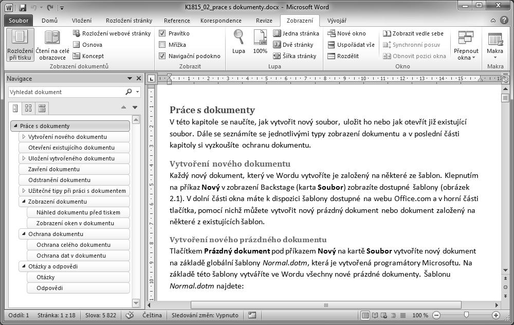 Záložka Procházet nadpisy v dokumentu (obrázek 2.6) umožňuje otevřít rozvržení dokumentu. Vidíte zde seznam jednotlivých úrovní nadpisů. Klepnutím na položku v seznamu přejdete rovnou na konkrétní místo v dokumentu, kde je nadpis umístěn.
