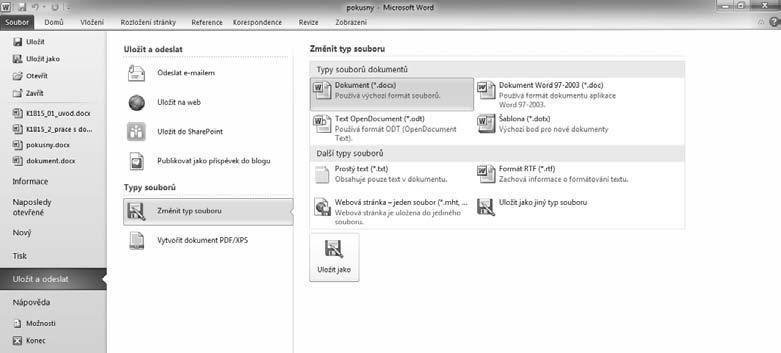 2. Vyberete příkaz Uložit a odeslat a v části Typy souborů zvolíte Změnit typ souboru.
