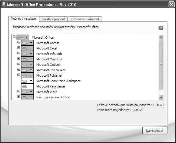 4. Otevřel se další krok instalace, kde zvolíte další postup. Nejprve nastavte na kartě Možnosti instalace, jaké aplik ace a jejich součásti chcete nainstalovat (obrázek 1.3). V pravém dolním rohu pak vidíte potřebný a volný prostor na disku. Pokud zde nic nezměníte, provádí se výchozí instalace.