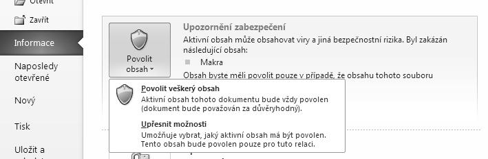 Novinkou v programech Office 2010 je možnost zobrazit dokument v chráněném zobrazení. V chráněném zobrazení se vám ve výchozím stavu zobrazují soubory pocházející z Internetu, soubory uložené v potenciálně nebezpečných umístěních a soubory, které jsou jako přílohy aplikace Outlook. Jestliže máte dokument zobrazený v chráněném zobrazení, je v režimu pouze ke čtení a zároveň máte skrytý pás karet.