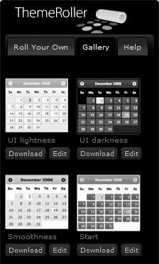 Jestliže chcete upravit vzhled komponent knihovny jQuery UI, nemusíte psát vlastní šablony stylů v jazyce CSS – na oficiálních stránkách knihovny jQuery UI najdete pod adresou http://jqueryui.com/themeroller/ velmi užitečný nástroj ThemeRoller. S jeho pomocí můžete prohlížet standardní motivy vzhledu, upravovat je a vytvářet zcela nové motivy vzhledu.