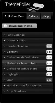 V případě, že budeme chtít vytvořit vlastní motiv vzhledu (nebo upravit některý současný), přijde nám vhod karta Roll Your Own. Na této kartě můžeme najít ovládací prvky pro nastavení hodnot jednotlivým vlastnostem komponent knihovny jQuery UI. Všechna nastavení na této kartě jsou rozdělená do přehledných skupin, jak můžete vidět na obrázku 2.4.