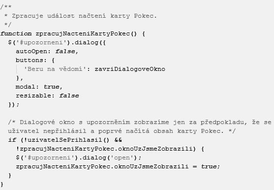 Tímto kódem nastavujeme, že při výběru (změně) prvku ze seznamu s identifikátorem seznam-motivu chceme zavolat funkci nastavMotivVzhledu(). Na druhém z předchozích řádků tuto funkci voláme rovněž hned po načtení stránky (jinak by po spuštění naší stránky nebyl nastaven žádný motiv vzhledu). Jak už název funkce nastavMotivVzhledu() napovídá, nastavíme v ní motiv vzhledu knihovny jQuery UI, a protože tato funkce prozatím neexistuje, doplníme ji na úplný konec souboru hlavni.js: function nastavMotivVzhledu() { var seznamMotivu = document.getElementById('seznam-motivu'), prvekVybranehoMotivu = seznamMotivu.options[seznamMotivu.selectedIndex], hodnotaVybranehoMotivu = prvekVybranehoMotivu.value;