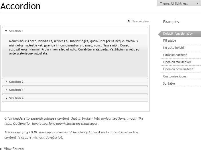 Jak vypadají jednotlivé komponenty s vybraným motivem vzhledu, si můžete ověřit v oficiální dokumentaci knihovny jQuery UI. Že je možné aplikovat motiv vzhledu na ukázky jednotlivých komponent, jsme si už říkali v části „Dokumentace knihovny“ této kapitoly.