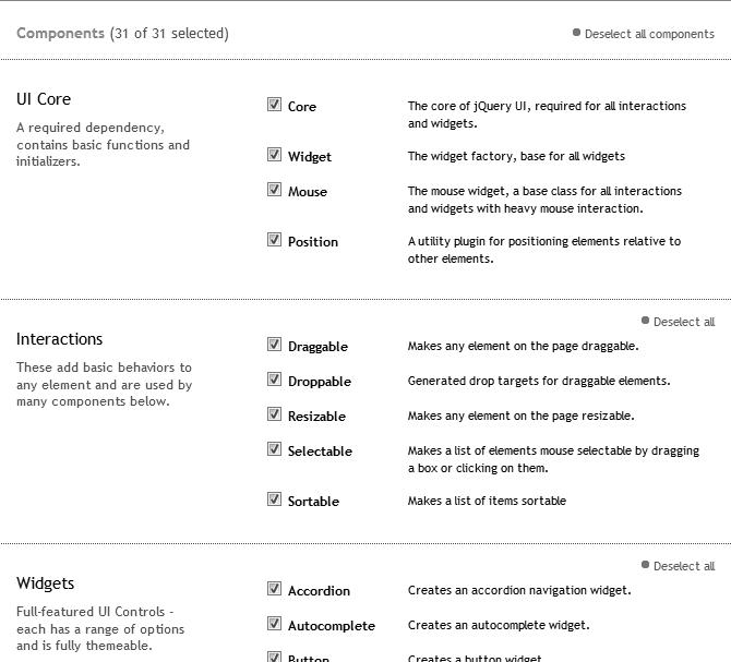 Komponenty se dělí do několika kategorií – Jádro knihovny jQuery UI (UI Core), Interakce (Interactions), Ovládací prvky (Widgets) a Efekty (Effects). Standardně bývají vybrané všechny komponenty. Pokud ale víte, že některé komponenty zcela jistě nebudete potřebovat, je rozumné zrušit jejich výběr. Čím více komponent bude výsledný skript knihovny obsahovat, tím bude větší a tím pomaleji se budou načítat vaše webové aplikace. Výběr komponent je možné zrušit přímo u jednotlivých komponent odškrtnutím příslušných zaškrtávacích polí, nebo můžeme zrušit výběr všech komponent některé kategorie klepnutím na její odkaz Deselect all; případně zrušit výběr všech komponent klepnutím na odkaz Deselect all components. Když zrušíte výběr všech komponent, automaticky se zruší také výběr motivu vzhledu, proto vybírejte motiv vzhledu raději až po komponentách.