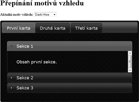 Celá myšlenka tohoto příkladu spočívá v tom, že obalujícímu elementu div s identifikátorem hlavni přiřadíme třídu podle hodnoty atributu value vybraného prvku (option) v elementu select s identifikátorem seznam-motivu. Všimněte si, že tyto prvky mají hodnoty motiv-dark-hive, motiv-start a motiv-ui-lightness. Přiřadíme-li některou z nich jako třídu elementu s identifikátorem hlavni, který obaluje celou naši stránku, aplikuje se motiv vzhledu s odpovídající oblastí platnosti (.motiv-dark-hive, .motiv-start nebo .motiv-ui-lightness) na všechny komponenty knihovny jQuery UI uvnitř něj.