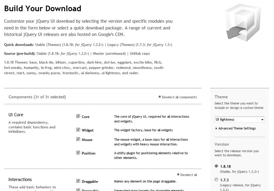Zde si můžete vybrat stabilní verzi knihovny jQuery UI nebo její starší verzi. Pokud nemáte důvod ke stažení starší verze, je vhodné stahovat stabilní verzi. Důvodem pro výběr starší verze knihovny jQuery UI může být například to, že ve svém projektu používáte starší verzi knihovny jQuery, pro kterou jste odladili všechny své skripty jazyka JavaScript a víte, že s novější verzí knihovny jQuery by nefungovaly.