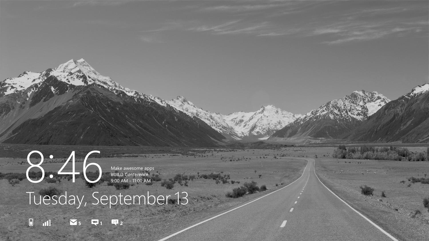 Zážitky, kterými se můžete motivovat k tvorbě vlastních aplikací, pokračují i po zapnutí. Zobrazí se takzvaná zamykací obrazovka, jejímž dominantním prvkem je obrazová tapeta. Když ji posunete směrem nahoru, zobrazí se klasický dialog k přihlášení, nebo se můžete přihlásit gesty. Všimněte si tapety podrobněji. Zobrazují se na ní zajímavé informace, například počet nepřečtených zpráv elektronické pošty a podobně. Plochu na zamykací obrazovce bude moct v případě potřeby využít i vaše aplikace, aby, pokud si to uživatel přeje, mu zobrazila hned po zapnutí počítače nebo tabletu důležité informace vyžadující jeho pozornost.