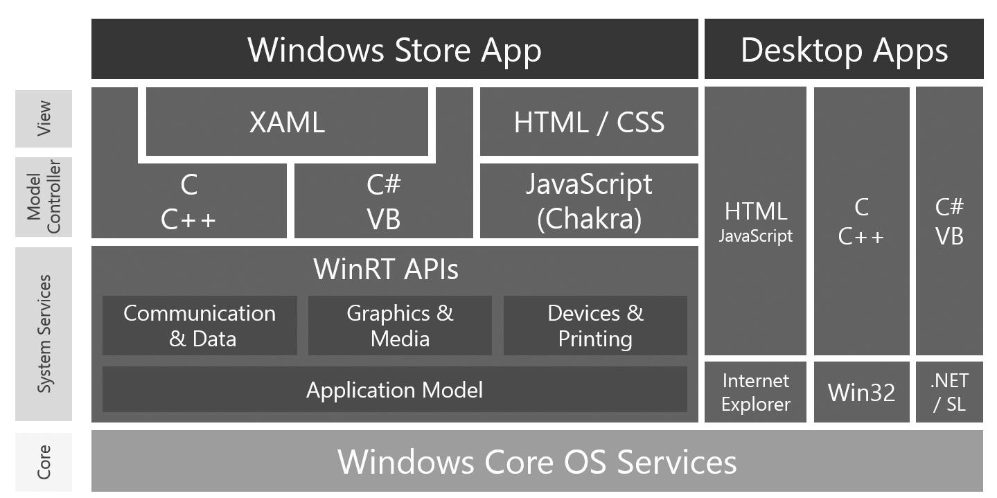 Na nejnižší úrovni architektury je jádro operačního systému, které je společné pro oba dva typy podporovaných aplikací. Pravá strana architektonického schématu představuje roky zažité webové a desktopové standardy (.NET Framework). Z hlediska náplně této publikace je důležitá levá část. Jejím základem je knihovna WinRT APIs (Windows Runtime API) pro podporu běhu nových aplikací pro Windows 8. Jednou ze základních vlastností WinRT APIs je asynchronnost. Vrstva aplikačního modelu sestává z modulů pro údaje, komunikaci, grafiku, média a modulu pro podporu externích zařízení.