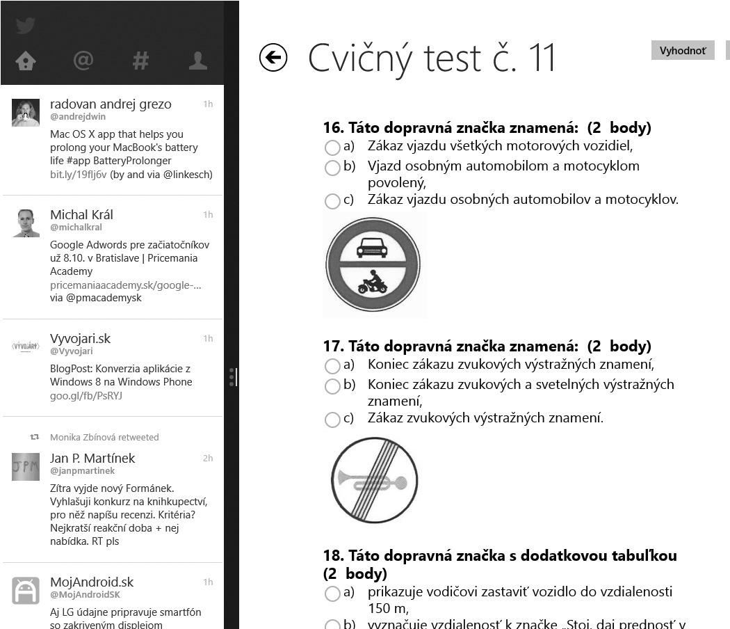 Na dalším obrázku je opačná situace. Aplikace Autoškola vpravo má k dispozici pás širší než 320 pixelů, ale užší než 500 pixelů. Pokud byla zobrazovací plocha v připnutém režimu Windows 8 příliš malá, aby aplikace mohla fungovat, tehdy jí nezbývalo nic jiného než zobrazit pouze statický, nebo dynamický obrázek. To je případ aplikace Autoškola, kdy nemá smysl, aby aplikace fungovala v úzkém pásu.