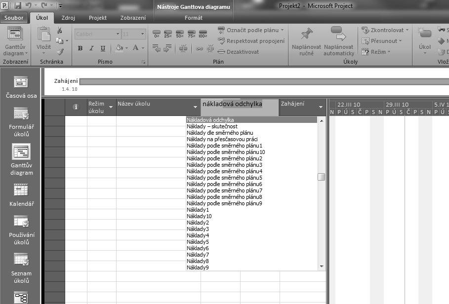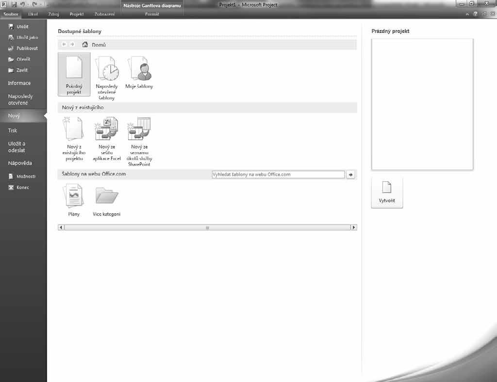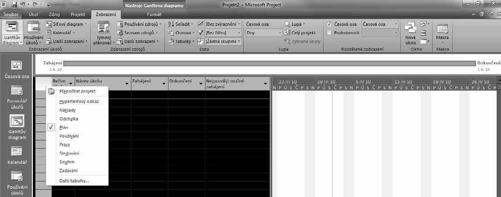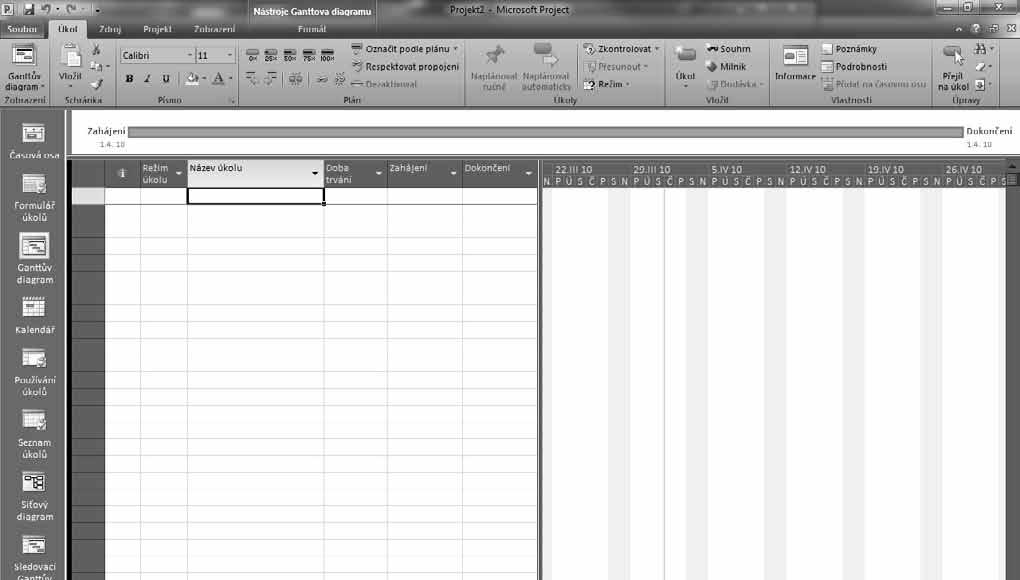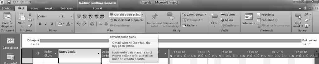 Obrázek 1.1 Nové uživatelské rozhraní aplikace Microsoft Project 2010