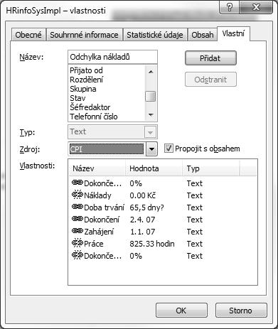 Vlastní – na poslední kartu můžete definovat další uživatelské vlastnosti. Ty můžete propojit s konkrétním obsahem souboru, jako například s celkovými náklady projektu či jinými údaji. Stačí si vybrat nebo napsat název pole, zvolit typ pole a zdroj z nabízeného seznamu polí Microsoft Project a zatrhnout tlačítko Propojit s obsahem