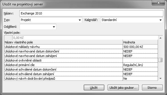 Pracujete-li s Microsoft Project Server 2010, setkáte se v rozhraní Backstage po klepnutí na nabídky Uložit, nebo Uložit jako s dialogovým oknem Uložit na projektový server Kromě toho budete mít k dispozici i kratší název projektu – a to přesně 200 znaků. Toto omezení však můžete kompenzovat možností popisovat projekt prostřednictvím vlastních polí organizace. Pokud nejsou vlastní pole pro projekt definována v rámci Globální šablony organizace, pak se v tomto dialogovém okně zobrazí šedá plocha. Podrobné informace k vlastním polím a ke globální šabloně obsahuje kapitola 7. Přizpůsobení aplikace Microsoft Project.