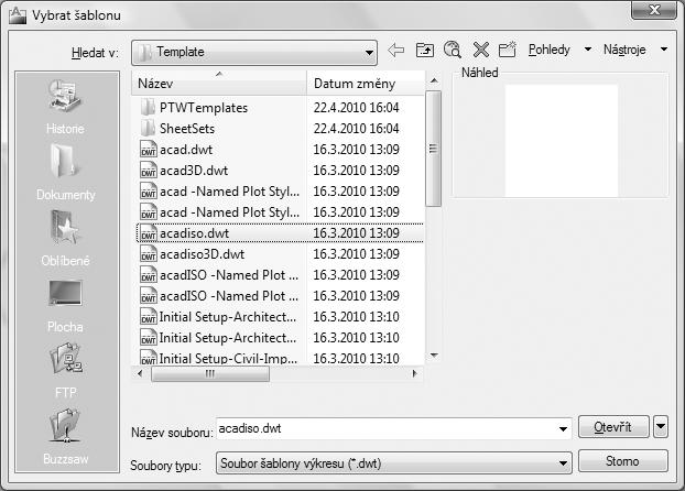 Pro otevření výkresu vyberte v rozbalovacím seznamu Soubory typu požadovaný typ souboru (výkres, šablona, DXF, standardy), v seznamu souborů a složek vyberte soubor, který chcete otevřít, a klepněte na tlačítko Otevřít