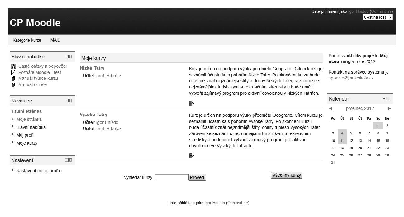 Upřete nyní pozornost na centrální část stránky, kterou vidí přihlášený uživatel. Jak už bylo uvedeno, v zobrazení Titulní stránka nebo v zobrazení Moje stránka vidí každý uživatel seznam e-learningových kurzů. Každý název kurzu tvoří hypertextový odkaz – pokud na něj klepnete, zobrazí se konkrétní kurz.