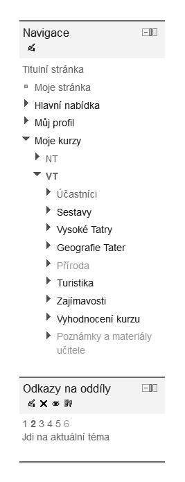 Obrázek 1.7 Ukázka navigace v e-learningovém kurzu prostřednictvím bloků Navigace a Odkazy na oddíly se mamateriálů a činností, které Odkaz na . Jeho