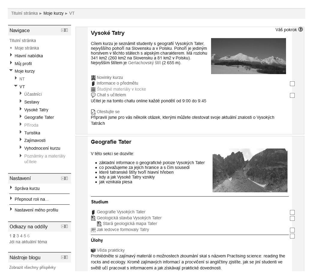 Po delší úvaze jsme za téma e-learningového kurzu zvolili Vysoké Tatry. Předpokládáme, že toto téma může být zajímavé pro českého i slovenského čtenáře, že mnoho čtenářů Vysoké Tatry už někdy navštívilo, a hlavně, že jednotlivé činnosti, které budeme v kurzu vytvářet, budou srozumitelné a snadno představitelné.