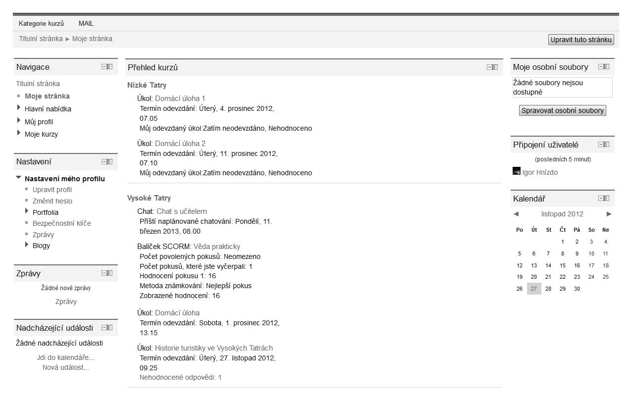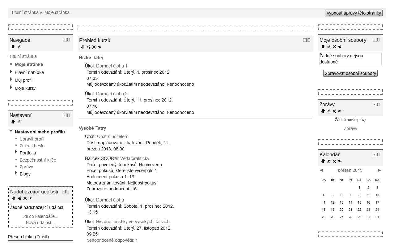 Po úspěšném přihlášení se zobrazí Titulní stránka (obrázek 1.2). Na rozdíl od titulní stránky Moodlu zobrazuje Titulní stránka informace určené konkrétnímu uživateli. Vpravo a vlevo se nachází bloky, které definoval správce systému. Ty slouží ke snadnější orientaci na stránkách Moodlu, umožňují přístup k profilu uživatele či zobrazují nadcházející důležité termíny.