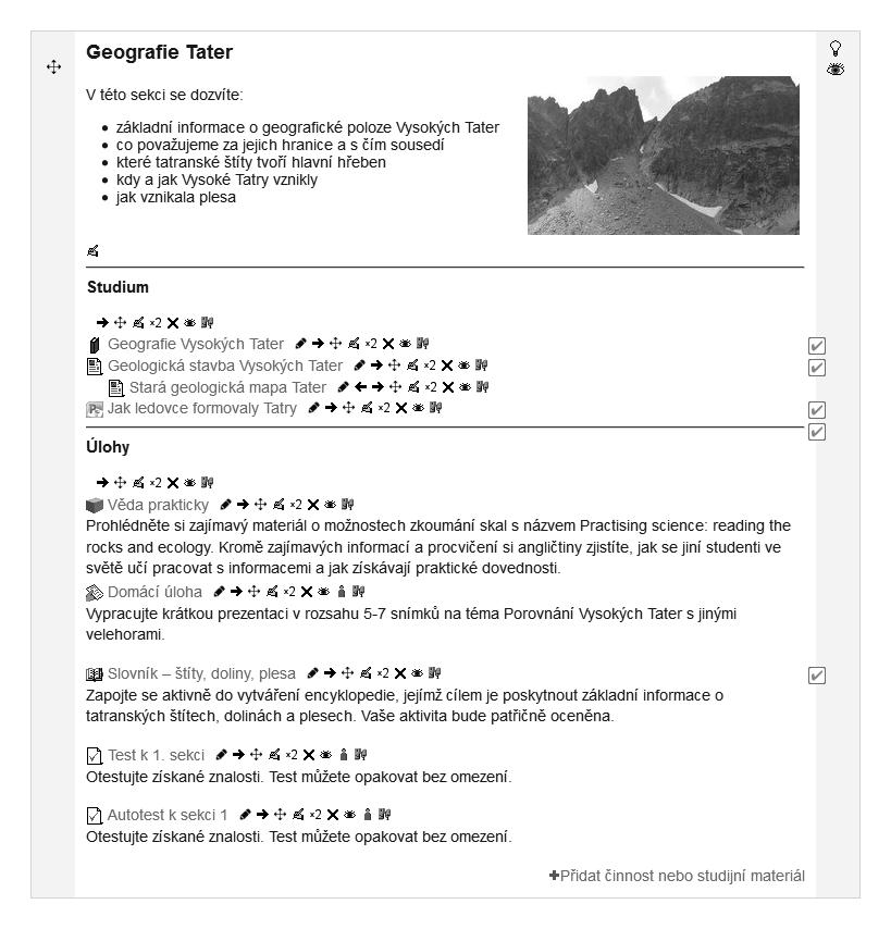 Po klepnutí na tlačítko Zapnout režim úprav se u každého studijního materiálu nebo činnosti na hlavní stránce kurzu zobrazí ikony k jejich další úpravě (obrázek 1.8).