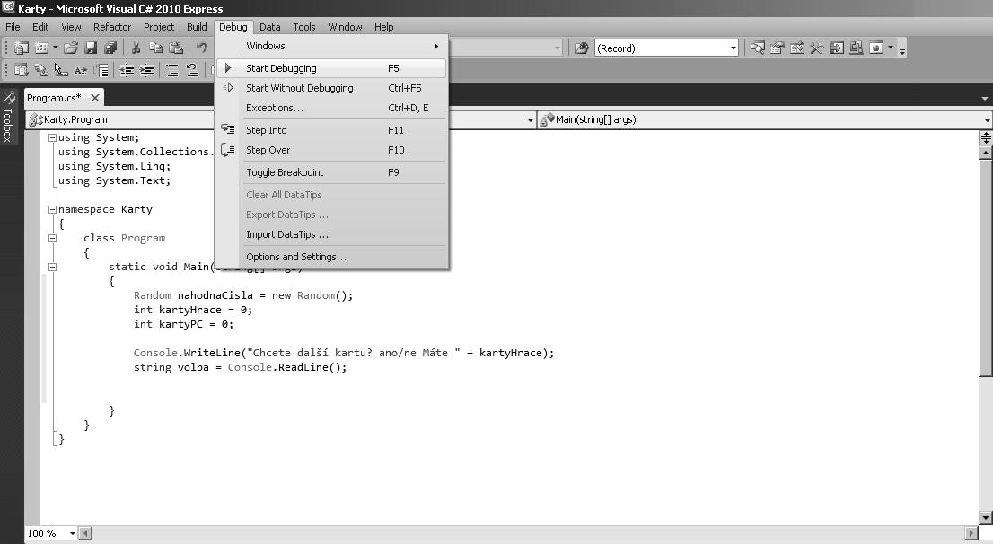 Vaše dosavadní metoda Main by měla vypadat takto: static void Main(string[] args) { Random nahodnaCisla=new Random(); //zatím jen opíšeme int kartyHrace=nahodnaCisla.Next(1,12); int kartyPC=nahodnaCisla.Next(1,12); Console.WriteLine(„Chcete další kartu? ano/ne Máte „ + kartyHrace); string volba=Console.ReadLine(); }