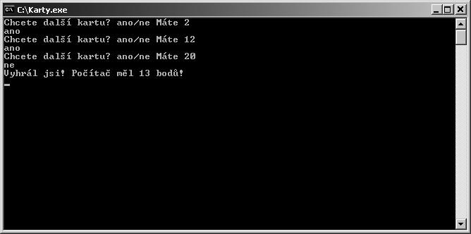 Ještě než se pustíte do další části, můžete si aplikaci spustit a tak si ozkoušet, že skutečně zobrazí zadaný text a hodnotu karet a čeká na vstup od uživatele, po kterém skončí.