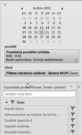 Panel úkolů se skládá ze tří částí –shora dolů je to tabulka s kalendářem, následuje část vyhrazená přehledu událostí a dole je uveden seznam úkolů. Velikost jednotlivých částí můžete změnit nebo je i skrýt.