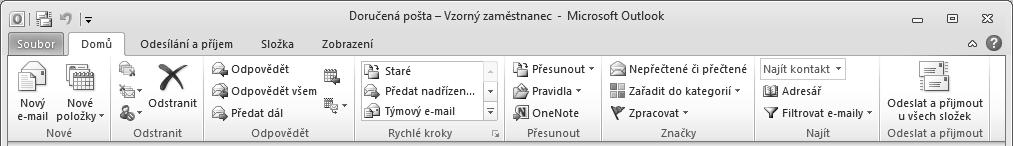 Doručená pošta dále obsahuje karty Odesílání a příjem, Složka a Zobrazení. Otevřením karty